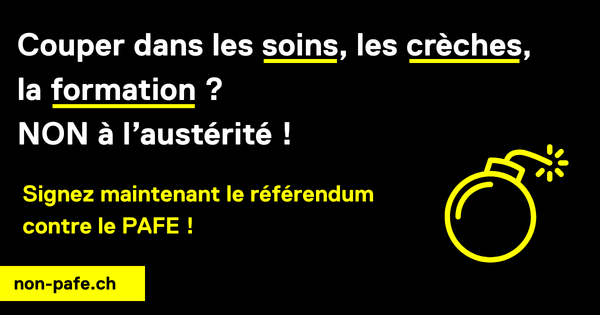 Et ce n’est qu’un début. Le PAFE annonce des années d’austérité et de démantèlement progressif des services à la population. Il est temps de dire stop. Signez le référendum dès maintenant.